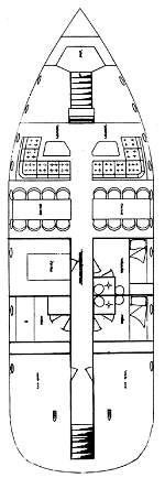 Overnight accommodations: 16 in 8 double cabins on main deck, 6 crew in 3