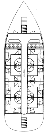 Overnight accommodations: 16 in 8 double cabins on main deck, 6 crew in 3